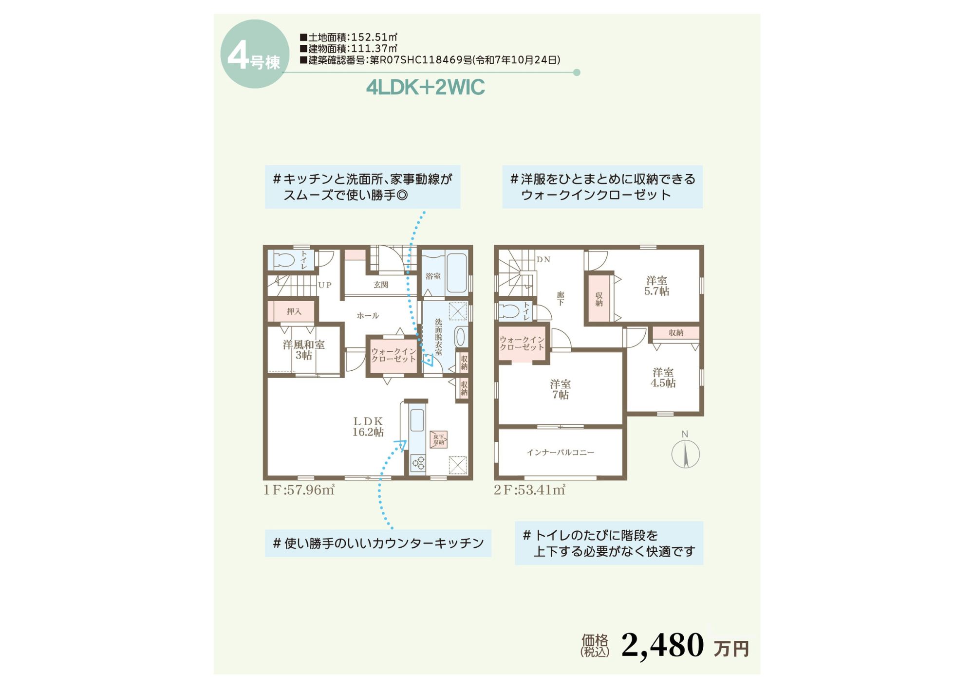 4LDK+ウォークインクローゼット2か所。キッチンから洗面所への家事動線がスムーズにつながり、忙しい朝も余裕が生まれる設計です。リビングを見渡せるカウンターキッチン、1階・2階の両方にトイレを配置し、家族みんなが快適に過ごせる間取りに仕上がっています。
